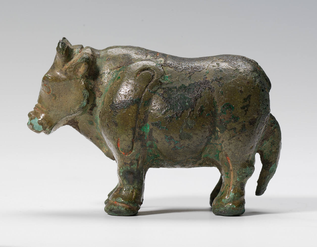 DescriptionHorned bullock standing four square. Volutes on either shoulder; olive-green patina.