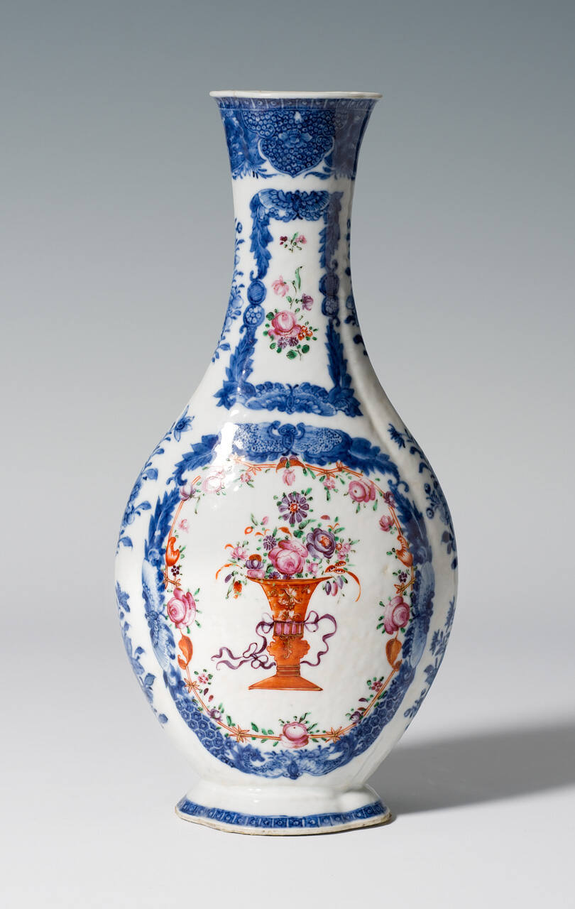 DescriptionFlattened vial shape on flared foot, borders of blue flowers and leaves around top and bottom and along contours of vase. On flattened sides: picture of vase and flowers surrounded by border of flowers and leaves all in burnt orange, pink, and green. One vase cracked in several places.