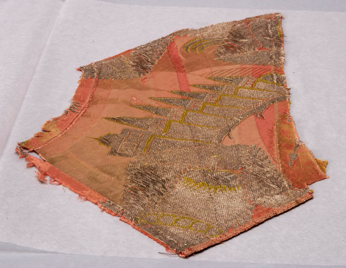 DescriptionConventionalized foliage design in green and silver thread on a peach background.
