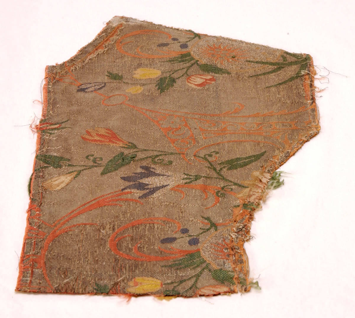 DescriptionConventionalized flower and stem motif in green, orange, and yellow on a background of silver thread.