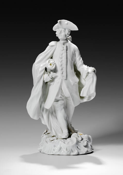 DescriptionStanding figure of a man wearing a tricorne hat; wig; knee-length coat wtih buttons down the front & wide cuffs; stockings; buckled shoes; flat bille (?) hands from top button on coat; rolled cloth under right arm; pair of shears in right hand; and flowing cloak over r. shoulder held to side by left hand; decorative base with applied flowers; crossed swords mark at back of base.Exhibition HistoryLuxury and Passion: Inventing French Porcelain, The Nelson-Atkins Museum of Art, Kansas City, Missouri, August 13 2022–August 12 2024, no cat.