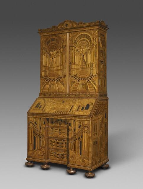 DescriptionA bureau cabinet, the exterior veneered with fantastic architectural perspectives in marquetry of various woods. The interior of the upper part contains pigeon holes and small drawers with a cupboard at the center. The bureau fall below contains a sliding writing surface with pigeon holes. Below are three ranges each of four drawers, the outside ranges can be concealed by doors which slide into the carcase. The cabinet is raised upon six carved walnut feet.Gallery Label