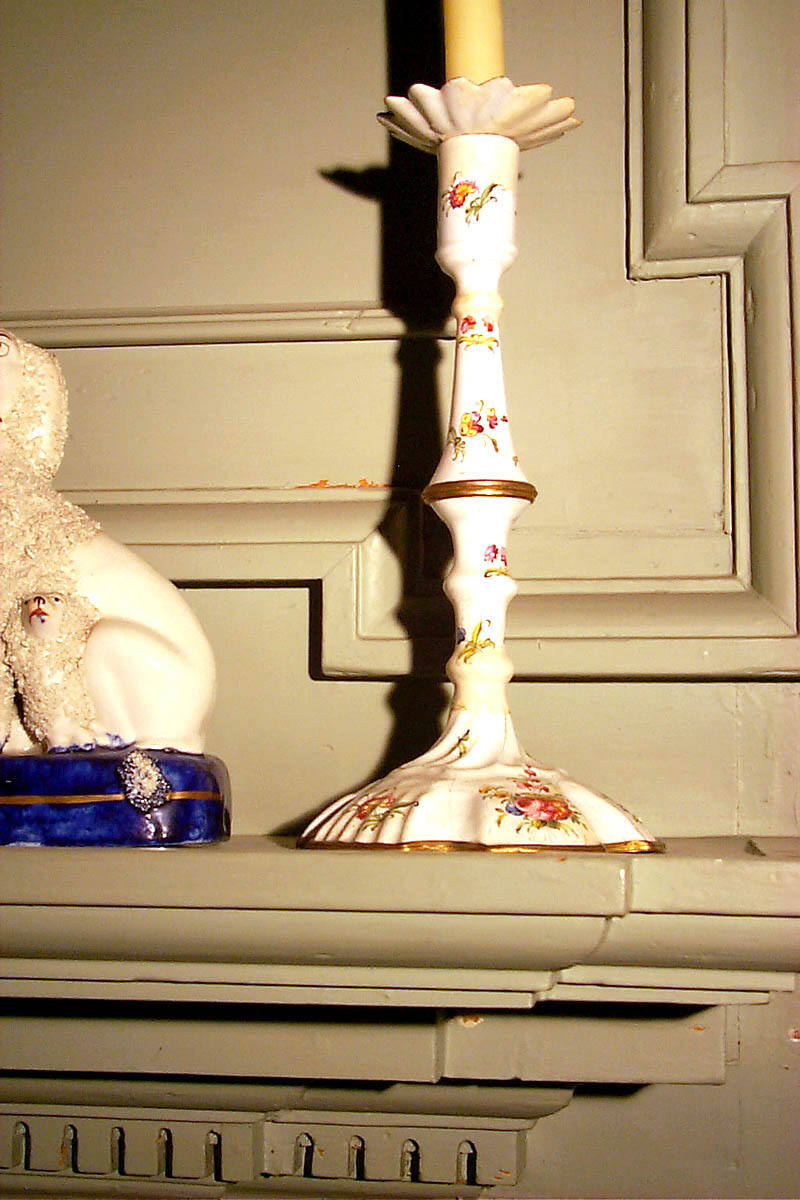 DescriptionWhite enamel base decorated with bouquets of flowers. Band of brass in middle of candlestick.