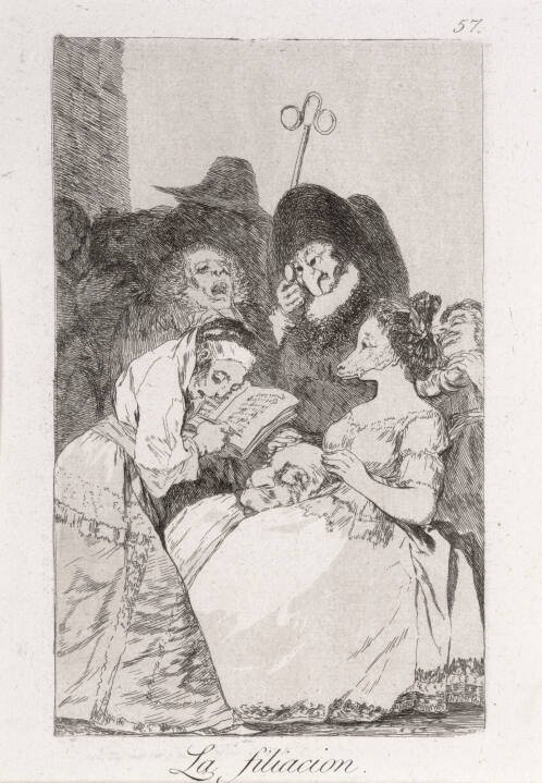 Tomás Harris, Goya Engravings and Lithographs (Oxford: Bruno Cassirer, 1964), 1: p. 113; 2: no. 92, p. 132, (repro.), as La filiacion. (The filiation.).