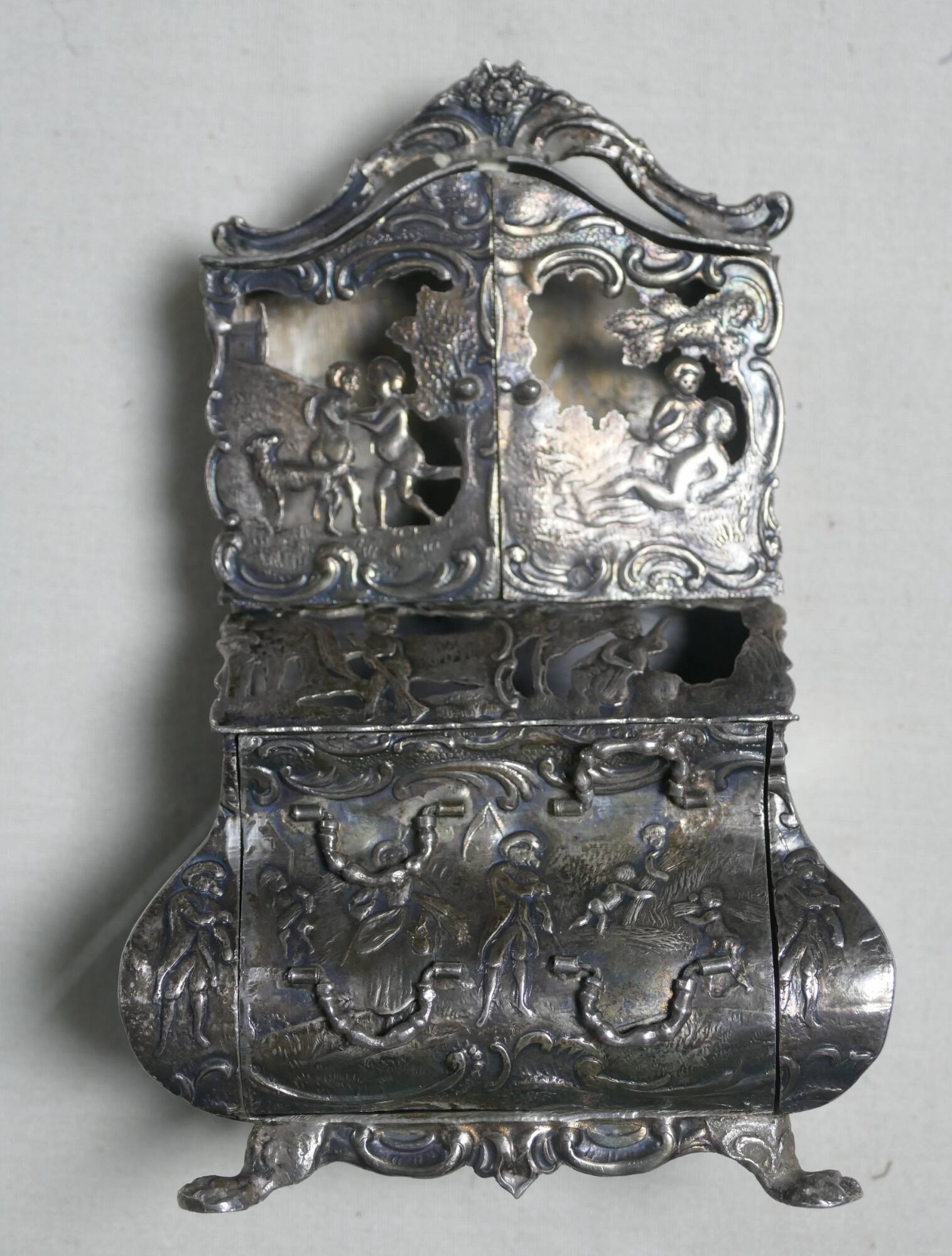 DescriptionBombé front, scrolled pediment, flower finial, movable four-handled drawer, scrolled apron, two-door upper section pierced, pierced desk lid, claw feet. Decorated all-over in repoussé with human figures, cherubim, and landscape.