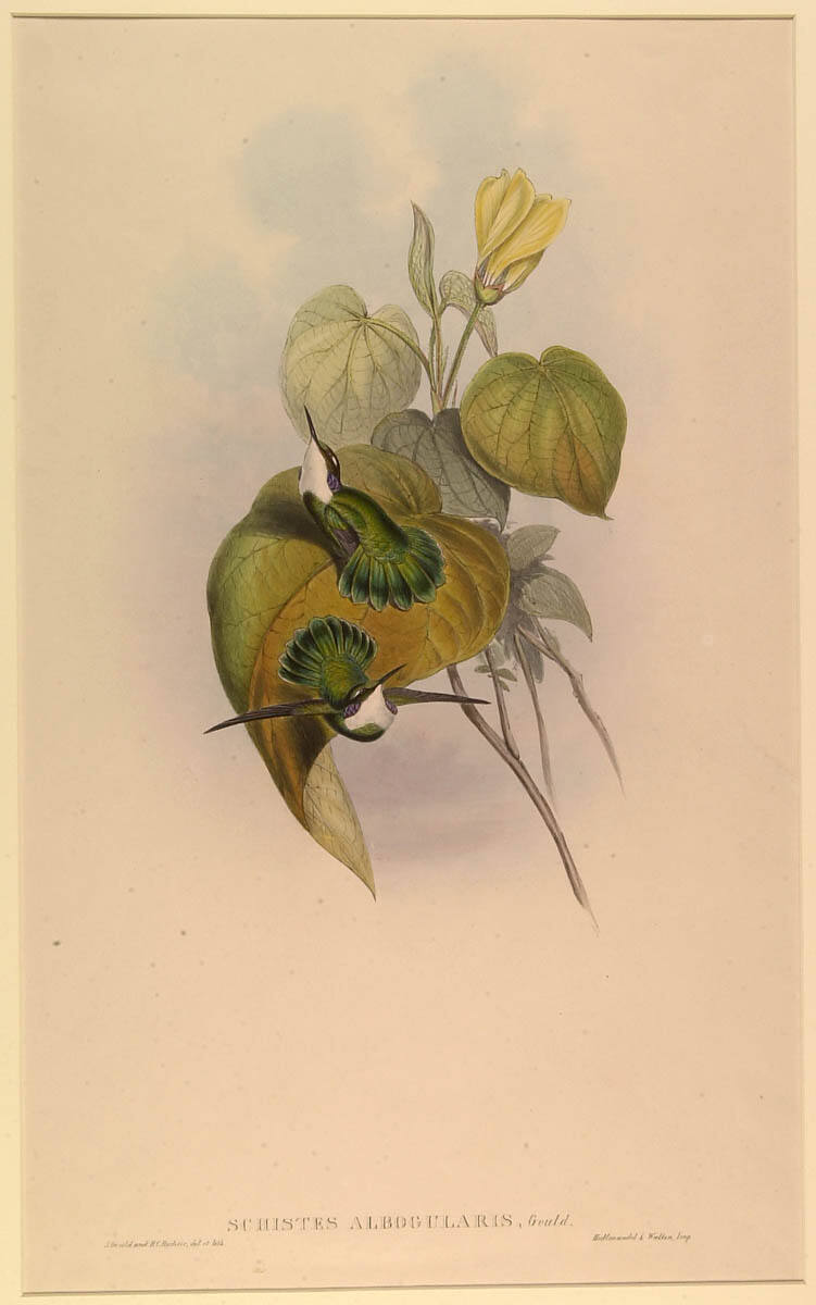 George L. McKenna, Prints, 1460-1995 (Kansas City, MO: Nelson-Atkins Museum of Art, 1996), 285, as Schistes Albogularis, Gould, from Gould’s A Monograph of Trochilidae, or family of hummingbirds.
