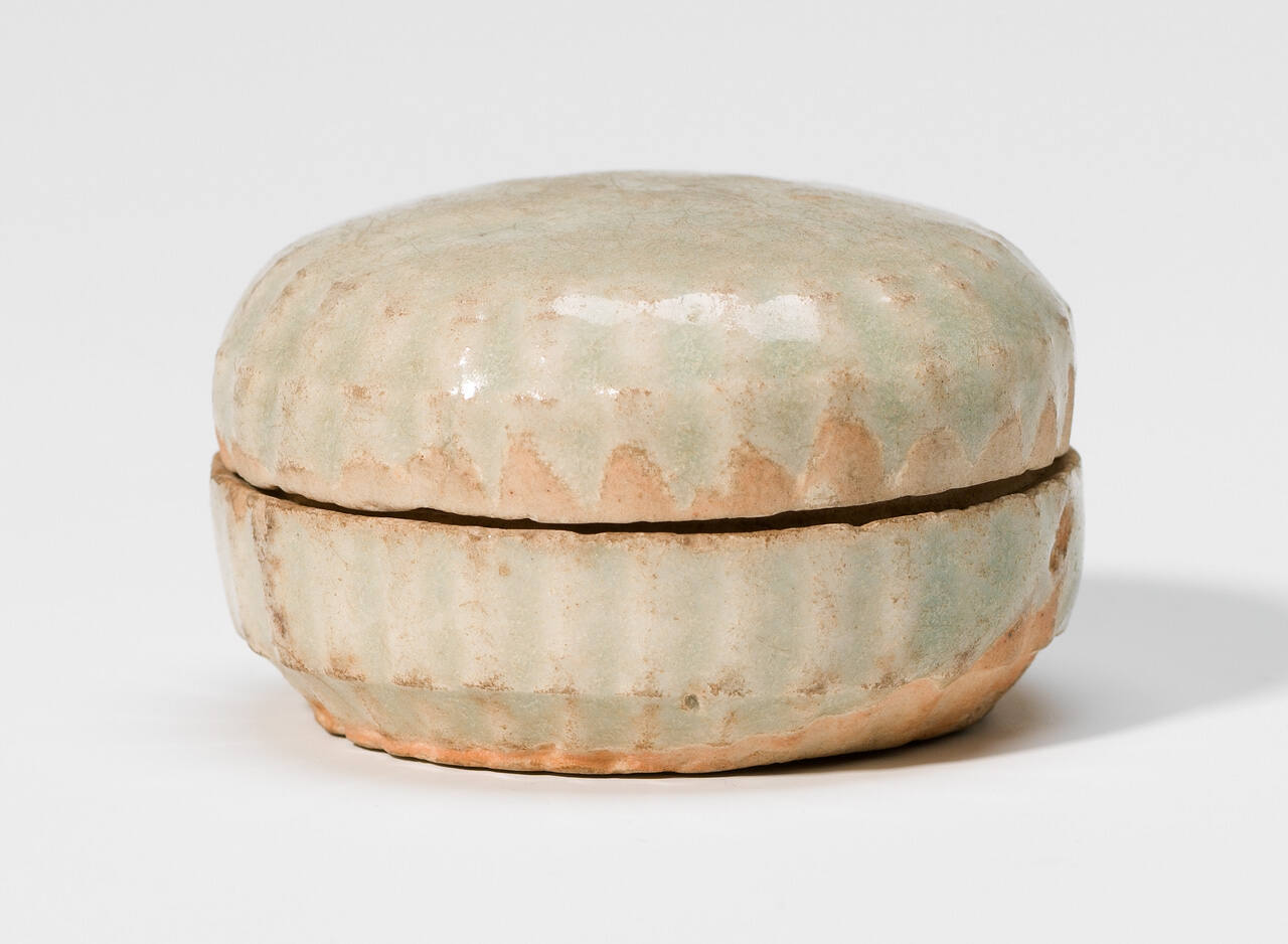 DescriptionWhite porcelainous body with light bluish green glaze. Box and lid meloned. All over floral pattern pressed in top.