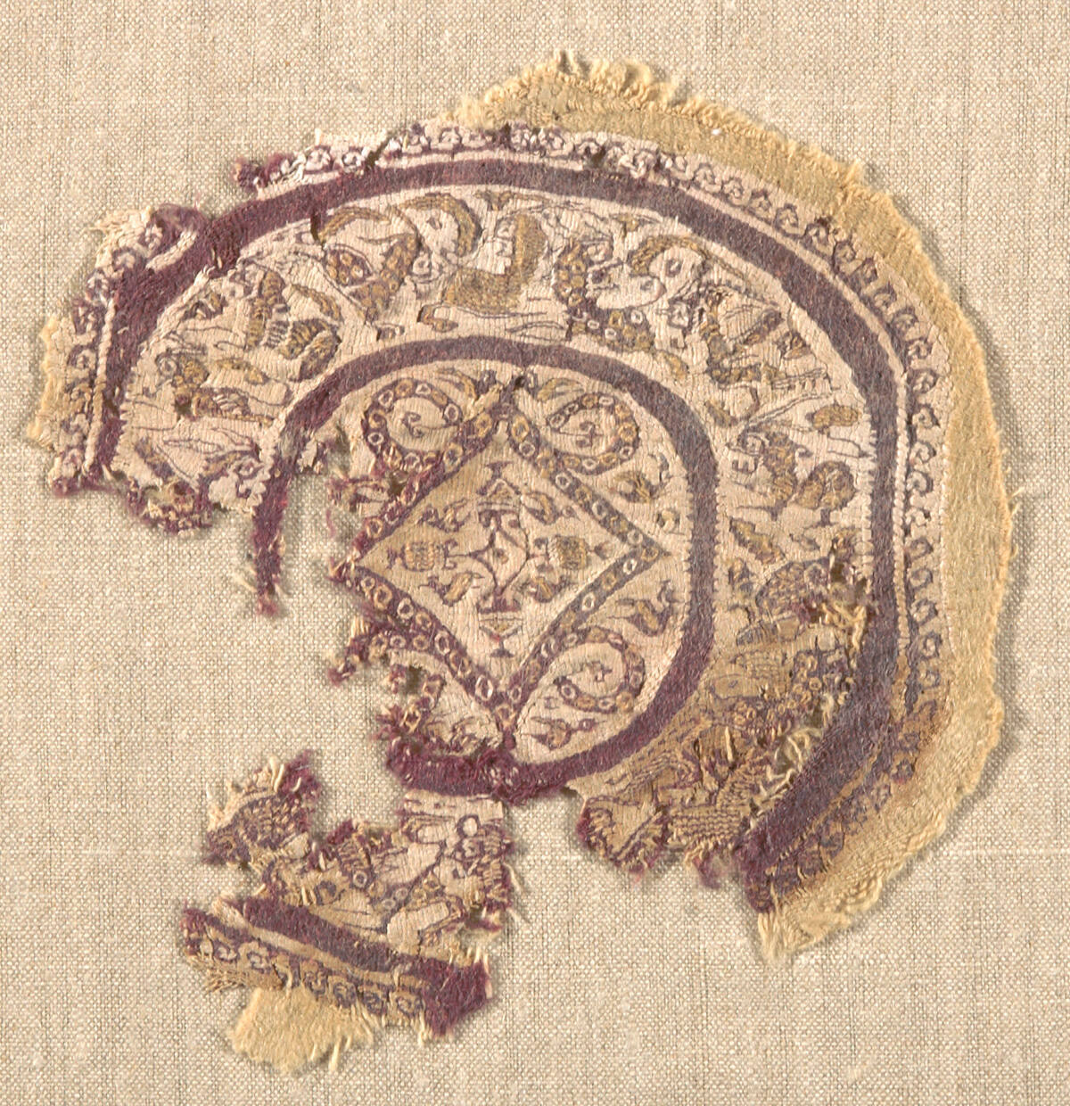 DescriptionRound tapestry; in purple and brown; of fantastic animals and birds.