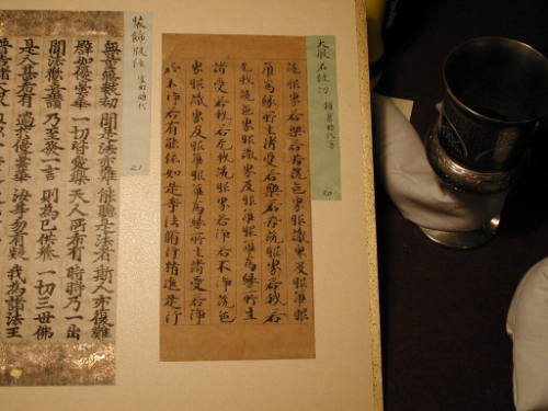 Gallery LabelThe calligraphy of this sutra is fluid and modulated. The varying shapes of the characters do not form a grid. Its casual quality makes a contrast to the rigid calligraphy next to it.