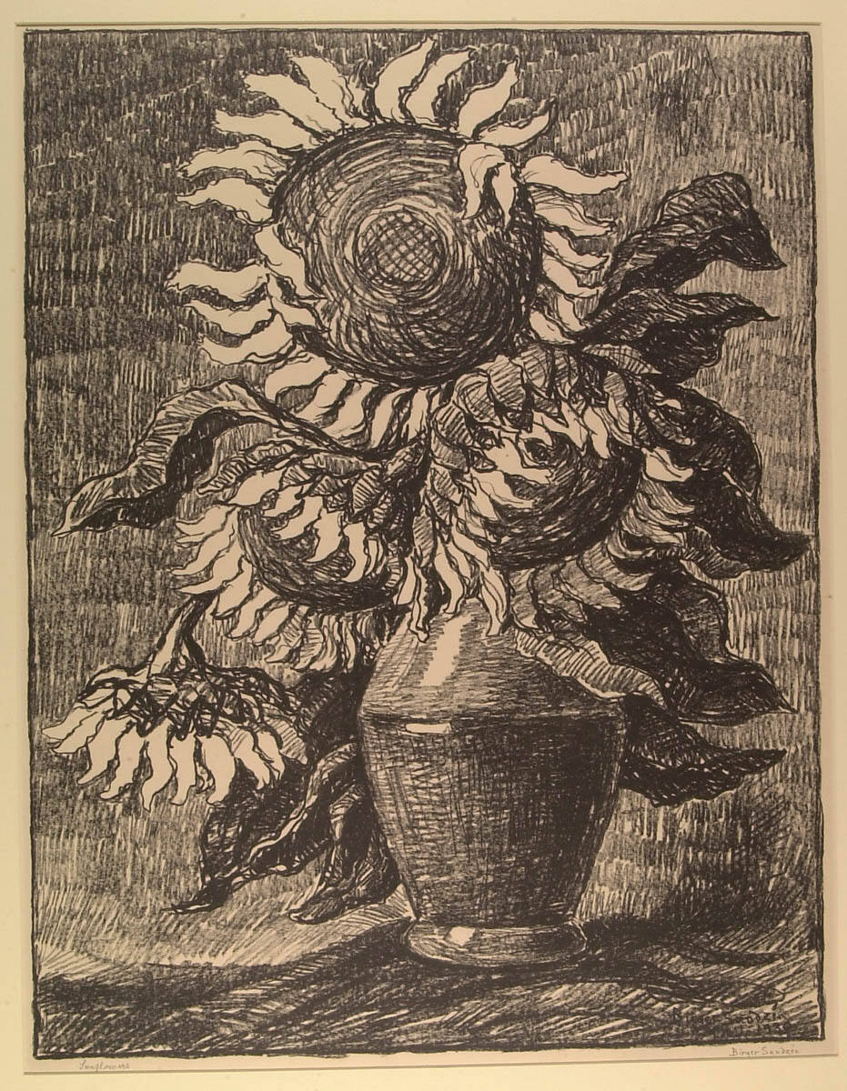 Gallery LabelThe subject of Sandzén's Sunflowers refers symbolically to Kansas, the artist's adopted home state, as well as artistically to Dutch painter Vincent van Gogh, who famously rendered sunflowers and whom Sandzén himself admired for his vigorous, colorful manner of painting. The lithographic technique successfully conveys the artist's dynamic and confident use of line.