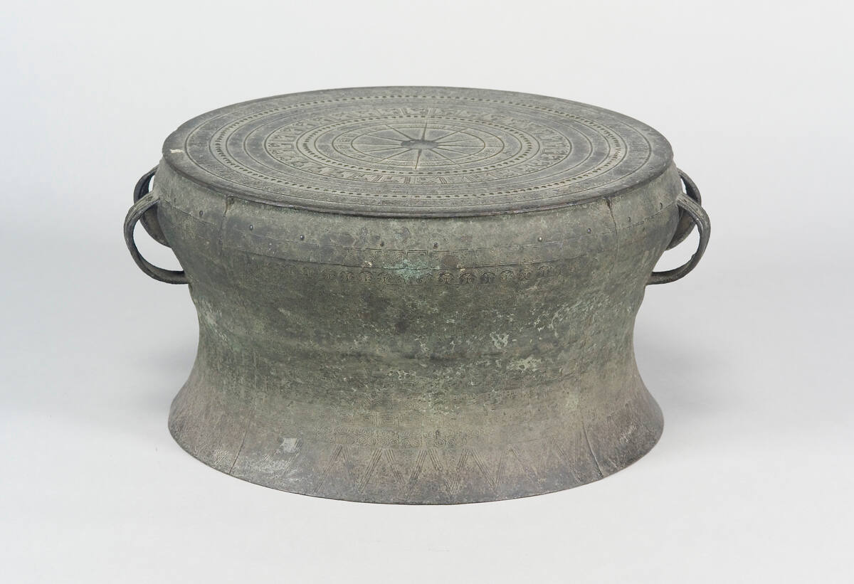 DescriptionDrum with a circular motif around the top, circular motif around the bottom, and loops attached at the sides.