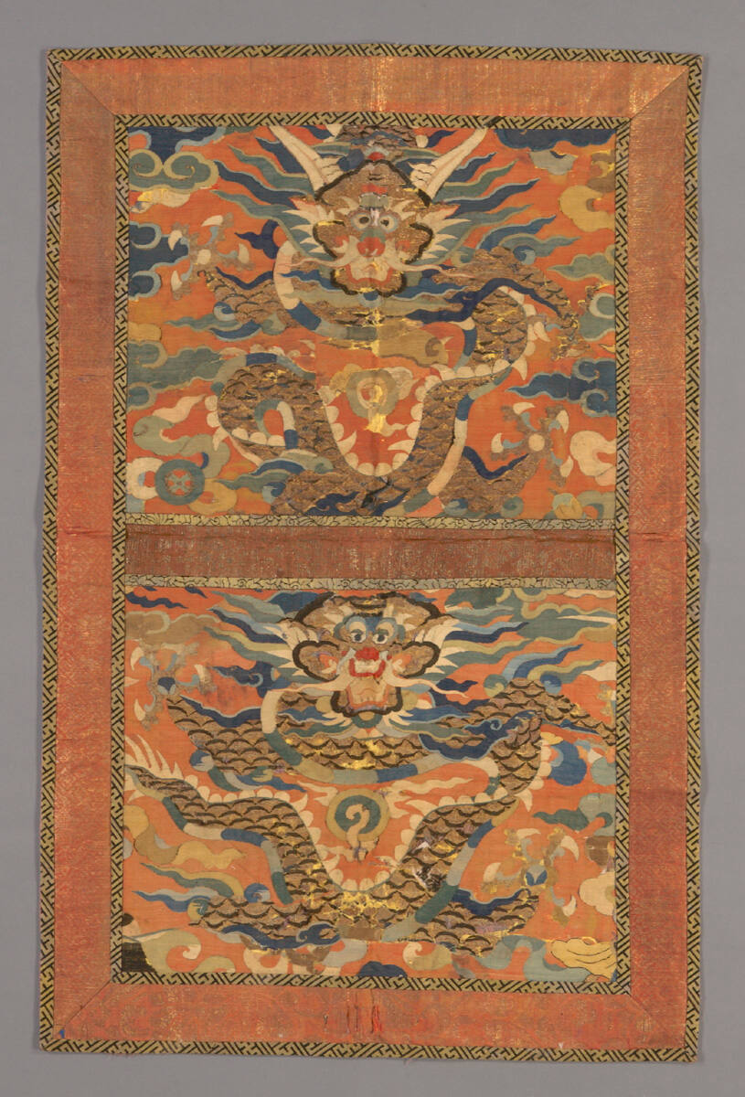 DescriptionPair of dragons, mounted on brocade, with faded red border, torn.