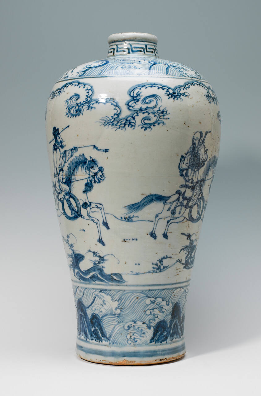 DescriptionBannister shaped vase, blue and white decorated with two figures on horseback in a landscape. Band at the shoulder of waves and horses on opposite sides.