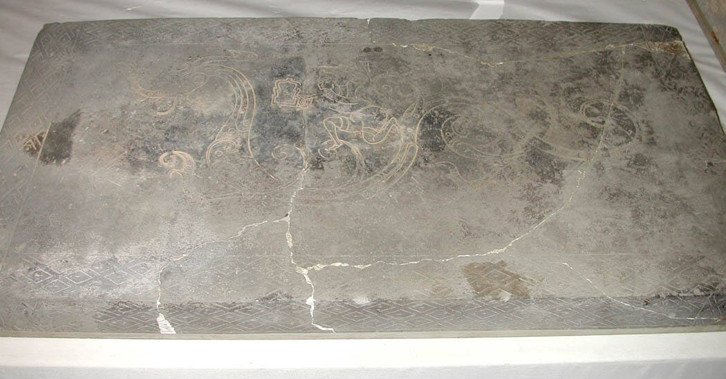 DescriptionThe object is a low-fired, rectangular-shaped ceramic piece. There is a incised (carved) dragon and warrior design on the top surface surrounded by a stamped diamond-patterned border. No trace of pigments is seen within the design. There appears to be a continuous layer of plaster that may be reinforced with iron rods on the back surface. The piece is attached to a 3/4-inch-thick piece of wood with screws into the plaster backing and possibly into the object itself.