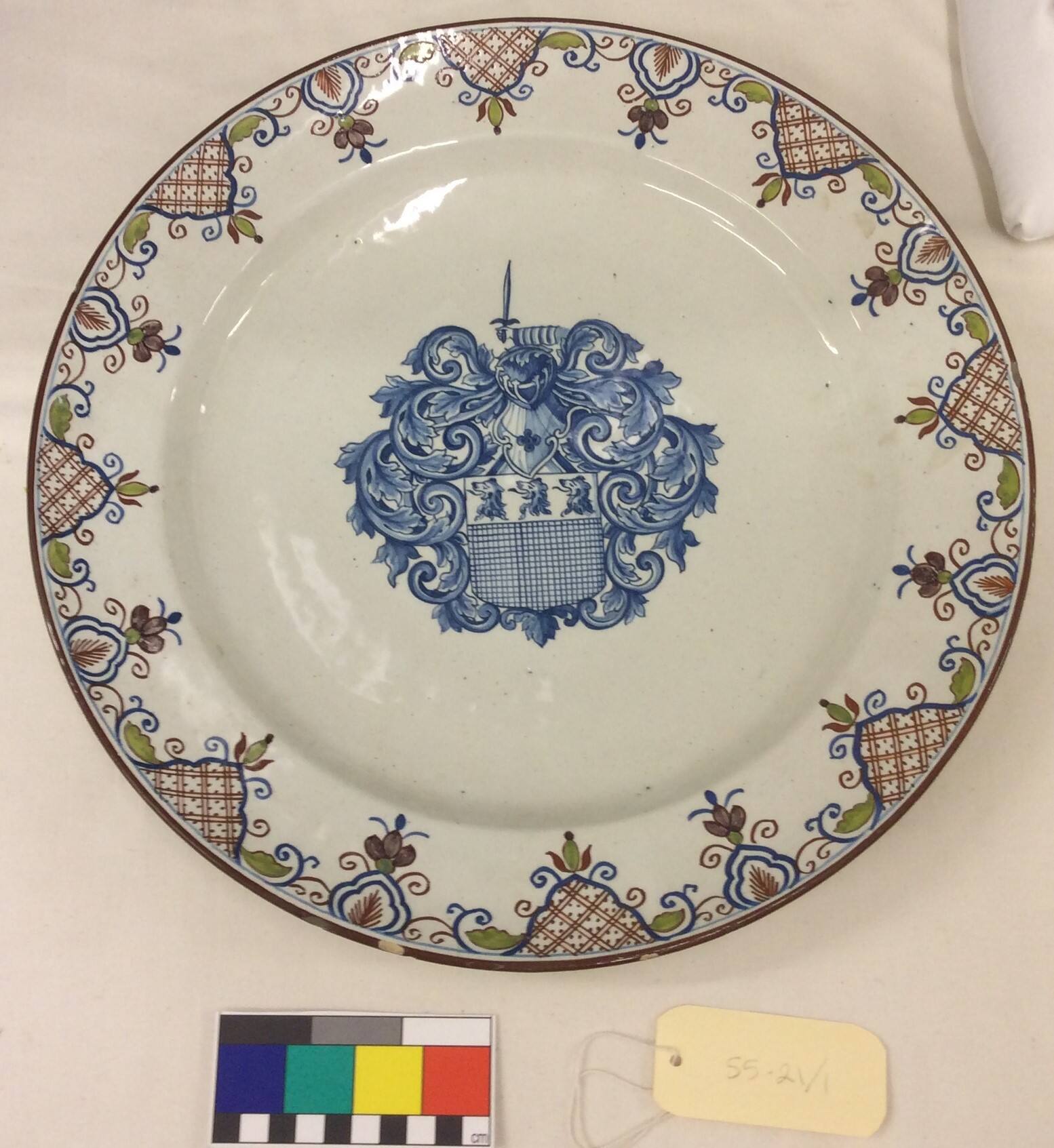 DescriptionCharger with floral, tendril and diaper border in polychrome of rust red, olive green, and manganese. Blue coat-of-arms, center, granted to Richard Richardson of Brierly, near Bradford, Yorkshire, England, Dec. 17, 1754.