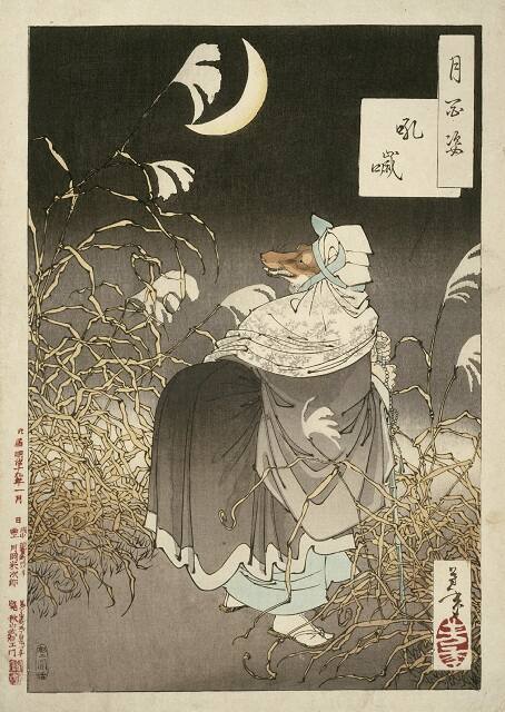 In Japanese folk tales, foxes and badgers are tricksters. They often disguise themselves as humans, ghosts, or even daily objects, such as those depicted in these prints. Some stories convey moral messages, while others suggest the close relationship between humans and swindlers.
