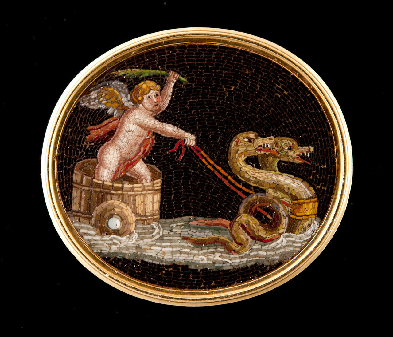 DescriptionOval mosaic medallion set into a gold pin. Cupid driving two sea serpents over the water.Exhibition HistoryOrigins: Collecting to Create the Nelson-Atkins, The Nelson-Atkins Museum of Art, Kansas City, MO, August 14, 2021-March 6, 2022.
