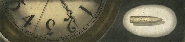 DescriptionOn a wide black band background is depicted an inverted half clock face, at left, and a bullet with a relief design on an egg-shaped cream area, at right.Copyright© Ron Fundingsland