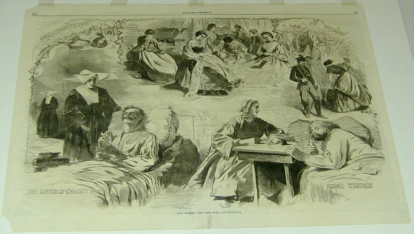 DescriptionA page removed from an edition of "Harper's Weekly." Several scenes of women sewing and tending to soldiers.
