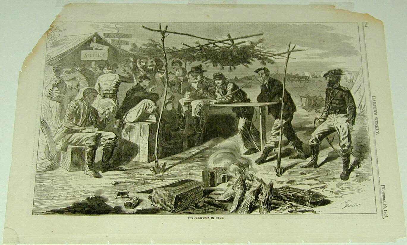 DescriptionA page removed from an edition of "Harper's Weekly." Soldiers standing and sitting outside a camp tent; some are eating.