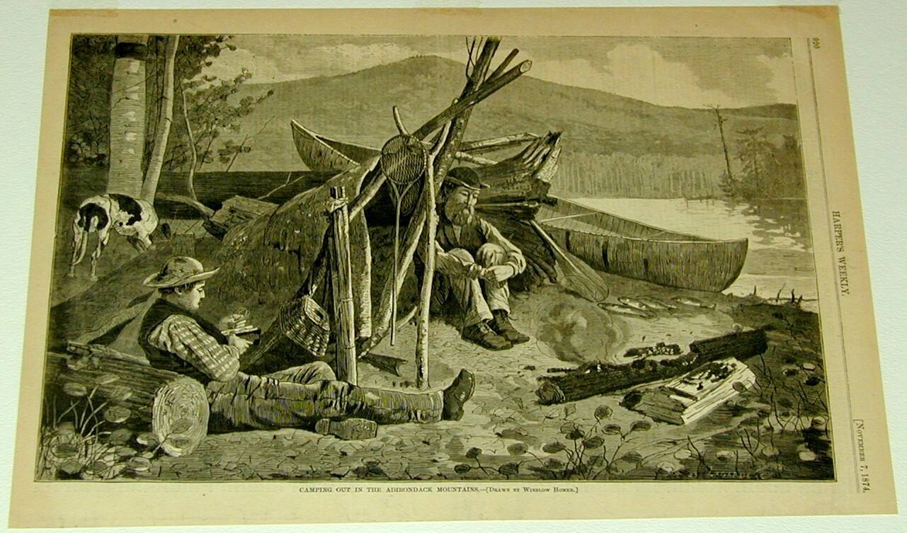 DescriptionA page removed from an edition of "Harper's Weekly." Two men sitting at a campsite next to a lean-to and a canoe; the camp is situated next to a body of water.