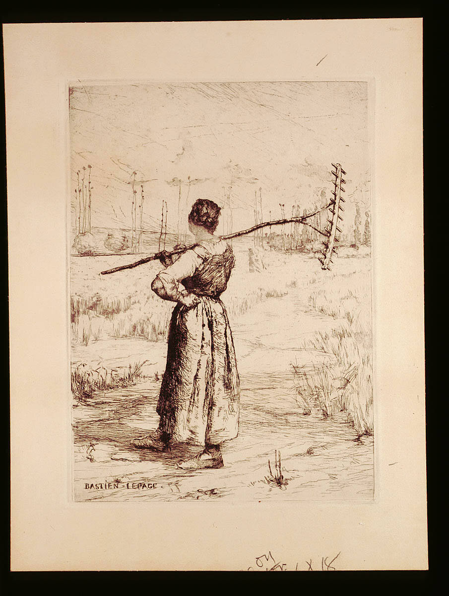 DescriptionA woman wearing a simple dress stands in a field; she stands with her back to the viewer; her left arm rests on the left hip. She holds a rake.Gallery LabelJean-François Millet, who struggled to support his large family, began producing etchings in the mid-1850s to earn income and help spread his name among potential buyers. His prints of rural French life appealed to the middle-class belief in the moral beauty of labor. Jules Bastien-Lepage’s poetic scenes, inspired by his memories of growing up on a farm, were also popular among city dwellers who yearned for the open air and simple pleasures depicted in his images. These timeless depictions of peasants fulfilling traditional roles were reassuring to the bourgeoisie, particularly when the class struggles and violent peasant uprisings of 1848 were still fresh in the public mind.