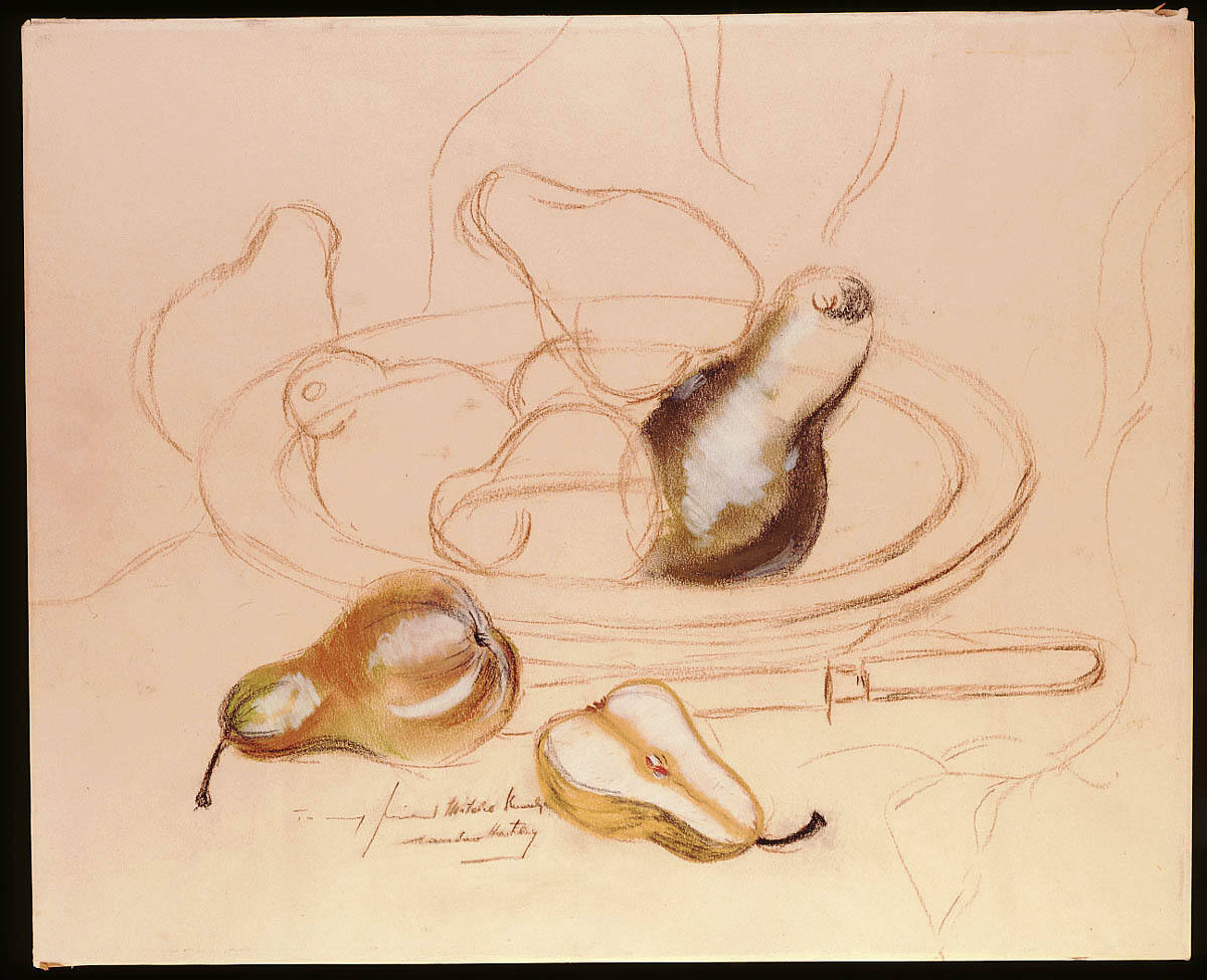 DescriptionDrawing/sketch of eight pears. Two appear in the foreground with a knife, five rest on a platter in the middle-ground, and one sits behind a platter to the left. Curved lines suggest drapery behind and around the still life.