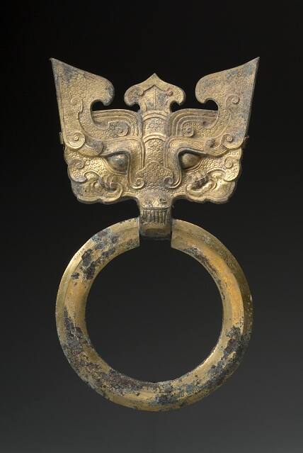 Gallery LabelThis escutcheon, or protective shield, would originally have been attached to the door of a tomb or a palace. The dragon has bulging eyes, furry eyebrows, scaly skin and pointed, wolf-like ears. Below each eye, his claws grasp his upper jaw as if he is fighting with himself, and his bared fangs clench the ring handle. Such dragon escutcheons clearly possessed a powerful apotropaic force, defending the space within from intruders, whether humans or spirits.