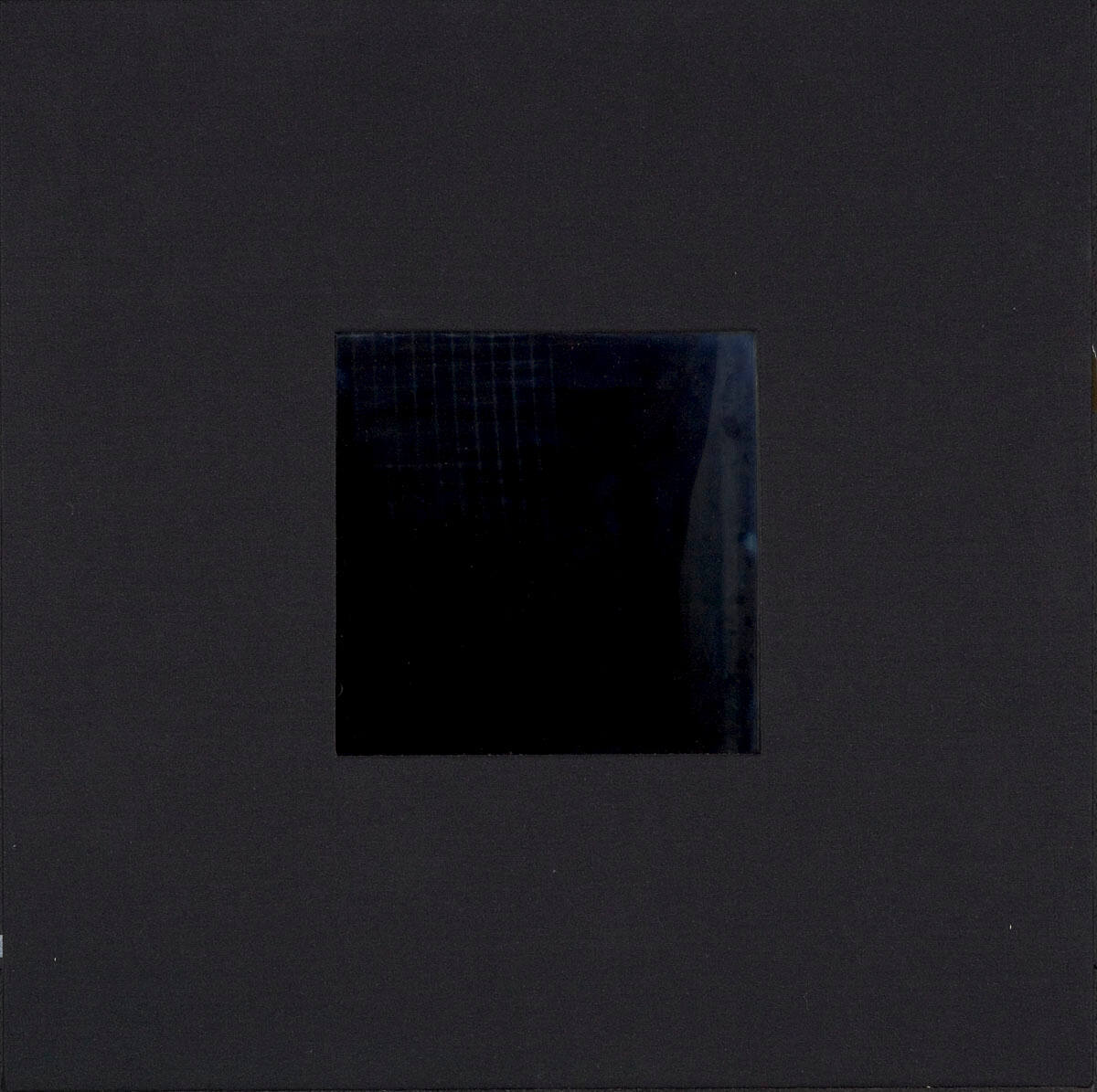 DescriptionTwelve inch square glass with patterns darkened by chemical application. Pattern 1: dark, horizontal lines spaced at approximately one inch intervals. Pattern 2: angled grid in light lines (left). Pattern 3: dark and light elliptical polka dots (right). Also a curve and straight line. Glass surrounded by wide expanse of black denim acting as a frame.Copyright© Larry Bell