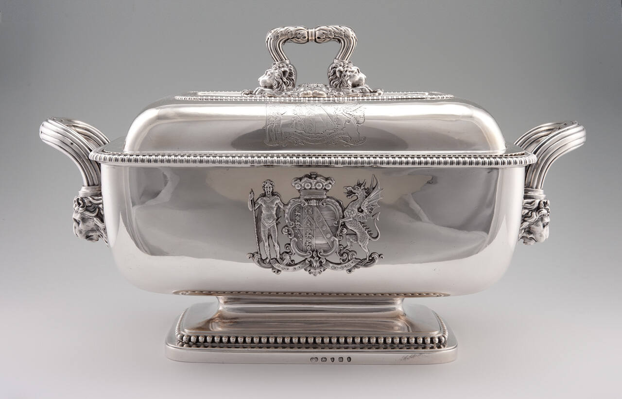 DescriptionRectangular form on spreading rectangular foot bordered with band of gadrooning, rising to plain rectangular body with reeded lion-head handles and gadrooned rim. Body with later cast and applied armorial with Baron's coronet; conforming cover with removable reeded lion-head handle; engraved one side with family's early armorial, opposite side with later armorial with added Baron's coronet. Conforming cover with removable handle and gadrooned interior rim for reversible use as a serving dish. Silver liner inside tureen, plain except for small shell-shaped handles.