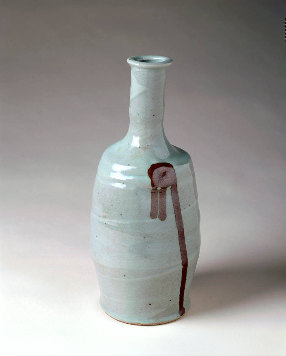 DescriptionBottle vase with long, narrow neck. Pale green glaze overall with three, long, brown drips emanating from one brown spot of glaze applied at slight indentation just below shoulder of vase.Copyright© Estate of Kenneth Ferguson
