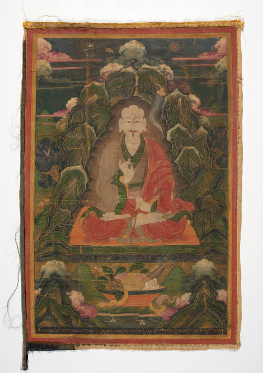 DescriptionIn front of his cave sits Saint Ajita, dressed in his monk's robe. He is seated on a dais covered with textiles. His right hand performs a warning gesture. His left is holding a yak tail staff. In front and below him is a ribboned vessel; it is filled with offerings which include a musical instrument and a conch. The saint, as the sole figure in this painting, is placed in a setting of mountains and clouds above and below his cave.