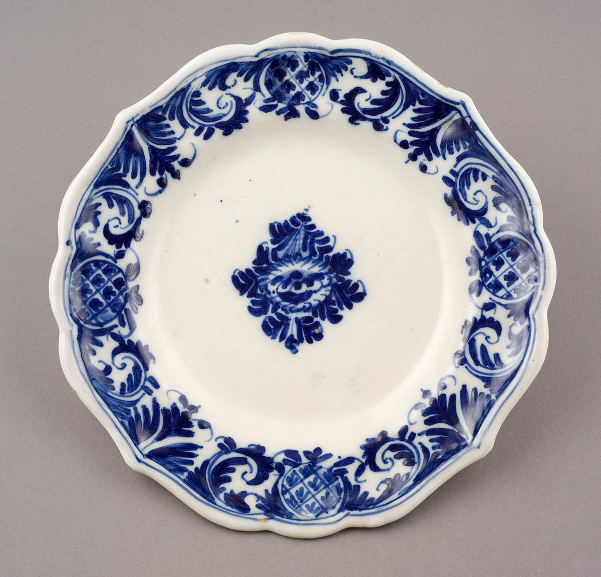 DescriptionRound ceramic plate with white glaze on both front and back. The front of the plate is decorated with cobalt blue foliate designs in a wide band around the scalloped rim. In the center is a similar blue decoration in a diamond-shaped pattern. The back of the plate is plain white.