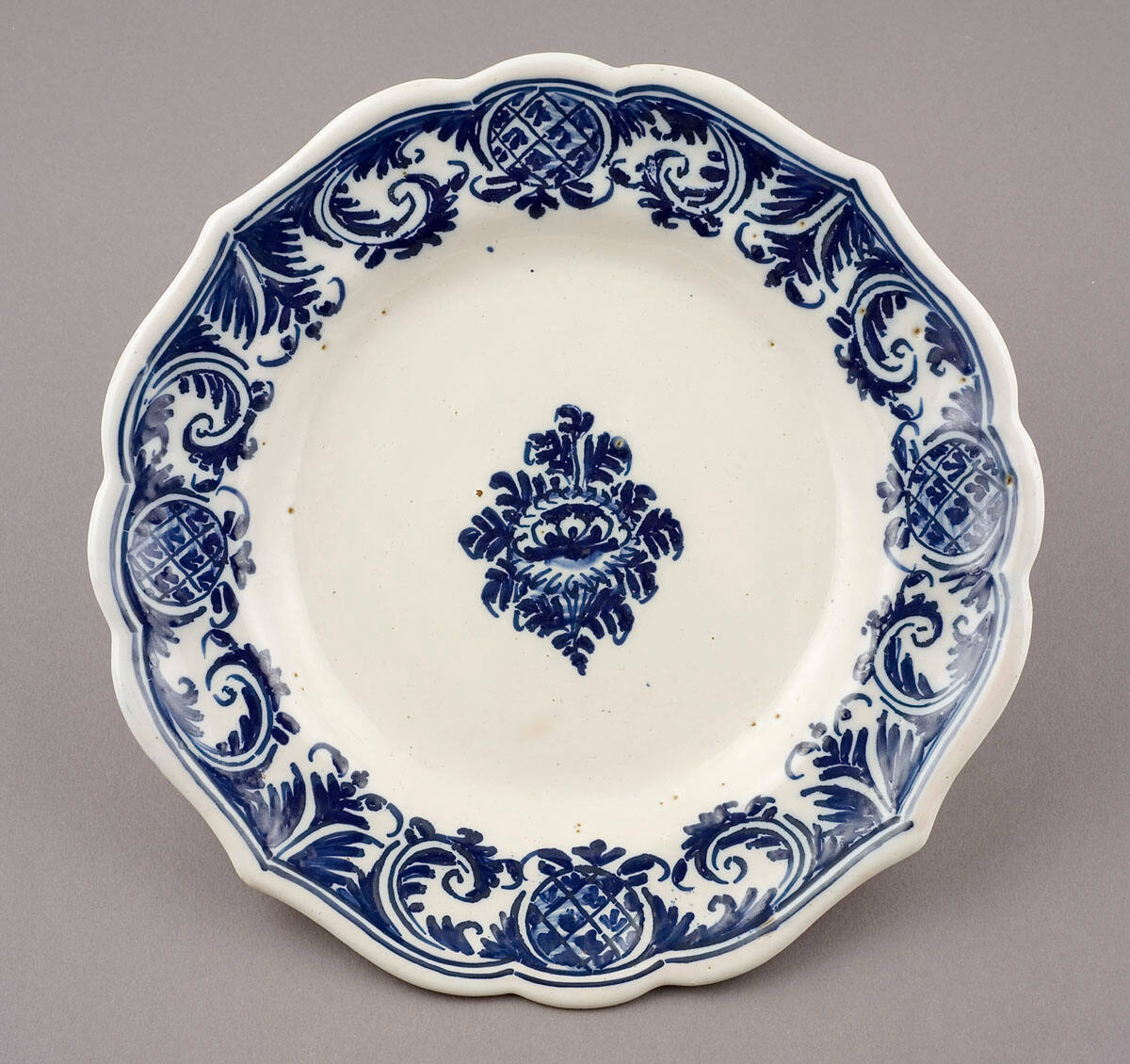 DescriptionRound ceramic plate with white glaze on both front and back. The front of the plate is decorated with cobalt blue foliate designs in a wide band around the scalloped rim. In the center is a similar blue decoration in a diamond-shaped pattern. The back of the plate is plain white.