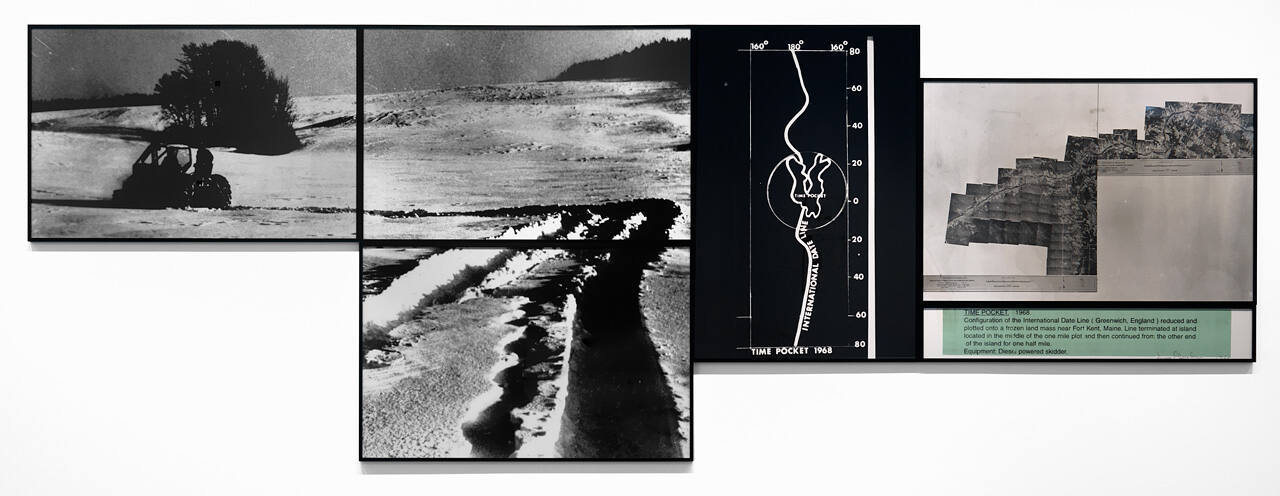 Oppenheim calls into question the meaning of time. He began with the idea of the International Date Line, the line of longitude that divides the globe into eastern and western hemispheres. Then he transferred a portion of this line to Maine and "drew" it by a diesel-powered skidder on a snowy field. The line stops at the south shore of a lake and resumes on its north shore, leaving the unmarked lake to suggest a site untouched by time.