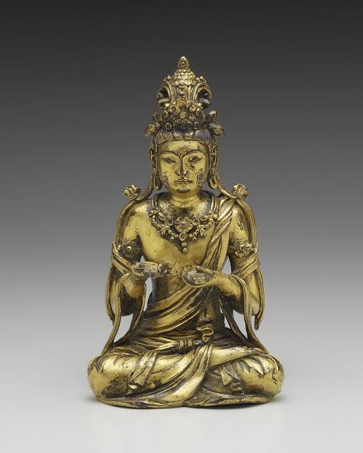 DescriptionThe seated gilt bronze figure faces forward with both hands extended with palms upward. The right hand has the palm facing out in the "varada mudra" (gesture granting wishes). The left hand is holding a rectangular booklet with a two-character inscription. The seated figure's legs are crossed with the partially clothed right foot set upon the left knee ("virasana") and its sole facing upward. The head of the figure is adorned with an elaborate, multi-layered bejeweled crown with hanging decorations, many of which end in a fleur-de-lis like design. The hair is neatly parted above the figure's face at the center and the back of the hair retains the centered part while being systematically divided into six parts. The hair also is bound as chignons atop the figure's head demarcating "ushnisha." The hair and crown interact to create a detailed and multi-faceted head decoration. The skin of the figure's arms, shoulders, chest, and back is exposed except for the draping scarves. The figure is dressed in a "dhoti" that covers both legs and is secured by a knot. The chest is adorned with a two-strand necklace with large jewels while the elongated ears and biceps are also adorned with similar jewels.ProvenanceR. H. Ellsworth Ltd.;