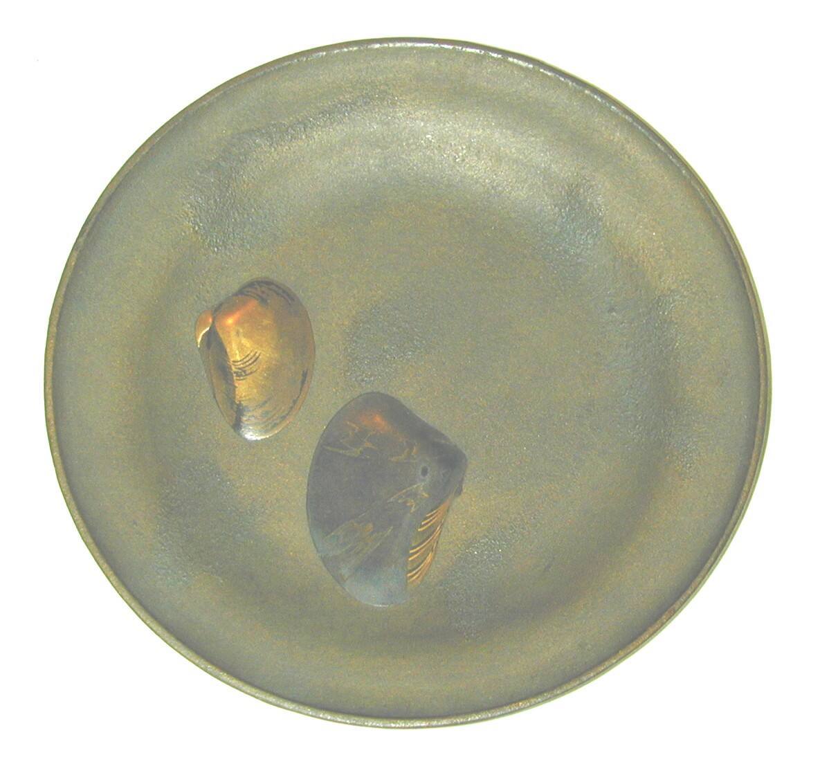 DescriptionSmall round plate with a mottled light brown textured ground, imitating old copper plates used by the Portuguese. Decorated with two clam shells: one, silver ground decorated with flying plovers in gold; the other, gold ground and a design of abstract (waves?) curving lines in silver.