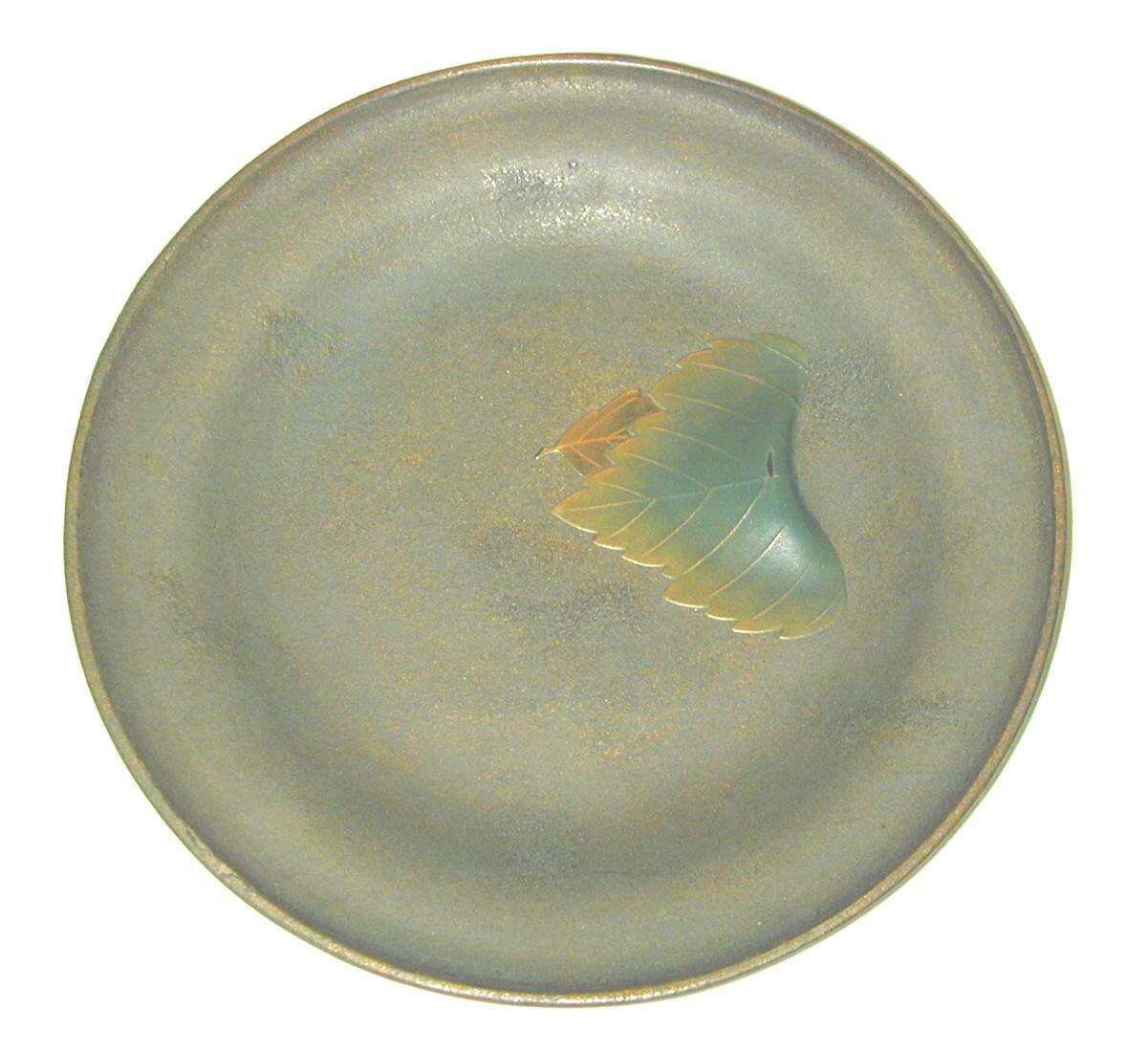 DescriptionSmall round plate with mottled light brown textured ground, imitating old copper plates used by the Portuguese. Decorated with a large green leaf tinged yellow at the edges, beneath which a small reddish leaf is barely visible.