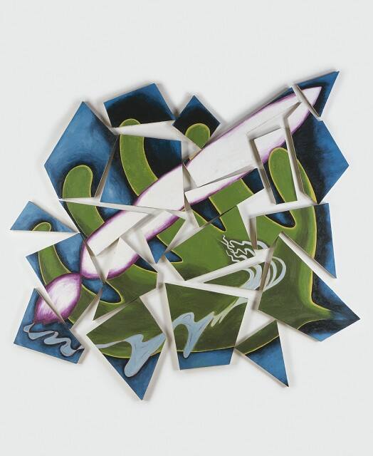 DescriptionConsists of 22 irregularly shaped canvases that are hung together to form the complete work. A green hand with splayed fingers thrusts diagonally from the lower right corner. It holds a white paintbrush with a purplish border, and appears to have just painted a light blue "brushstroke." The background is darker blue.Gallery LabelElizabeth Murray's canvases feature lively, cartoon-like images. In Art Part, a green hand grasping a white and reddish paintbrush trails a meandering brushstroke.