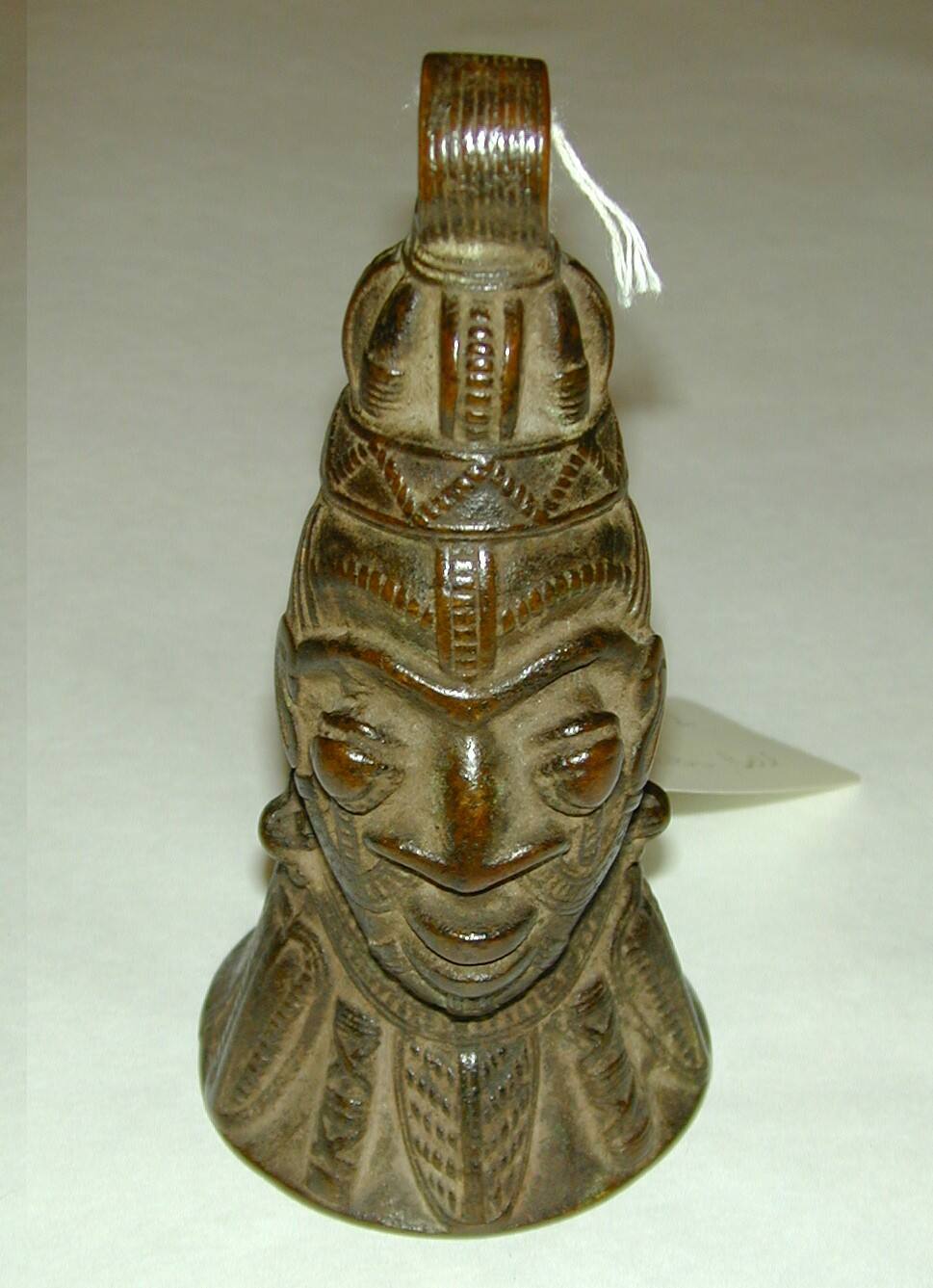 DescriptionThis metal bell is in the shape of a human head. Bulging eyes, a wide nose, stylized ears, and thick, closed lips characterize the face. A crown-shaped form surmounts the head. Raised scarification covers the forehead, cheeks, and chin. A necklace and decorative forms cover the front of the flaring portion of the bell.ProvenanceHarrison Jedel (1924-2016), Kansas City, MO, by 2000;