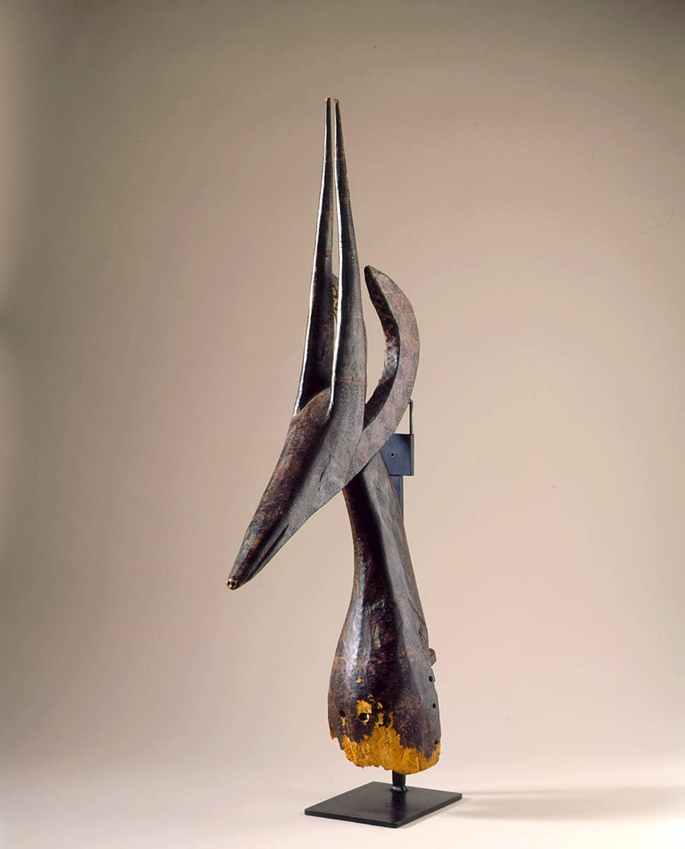 DescriptionThis helmet is in the shape of an elongated antelope's neck and head. The long horns jut upwards, and the large, stylized ears curve from the back of the head upwards toward the horns. A pigmented design consisting of small triangles covers the entire surface of the mask.ProvenanceHarrison Jedel (1924-2016), Kansas City, MO, by 2000;