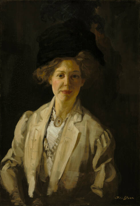 John Sloan's quick, confident brushwork summarizing Katherine Sehon's clothing contrasts with the dense, fine strokes he used to work her face. This technical shift suggests more effort was required to capture her likeness and personality. A 17-year-old neightbor of Sloan's, Sehon is portrayed as a proper lady. This is a rare portrait of a middle class subject by an artist better known for his paintings of urban life.