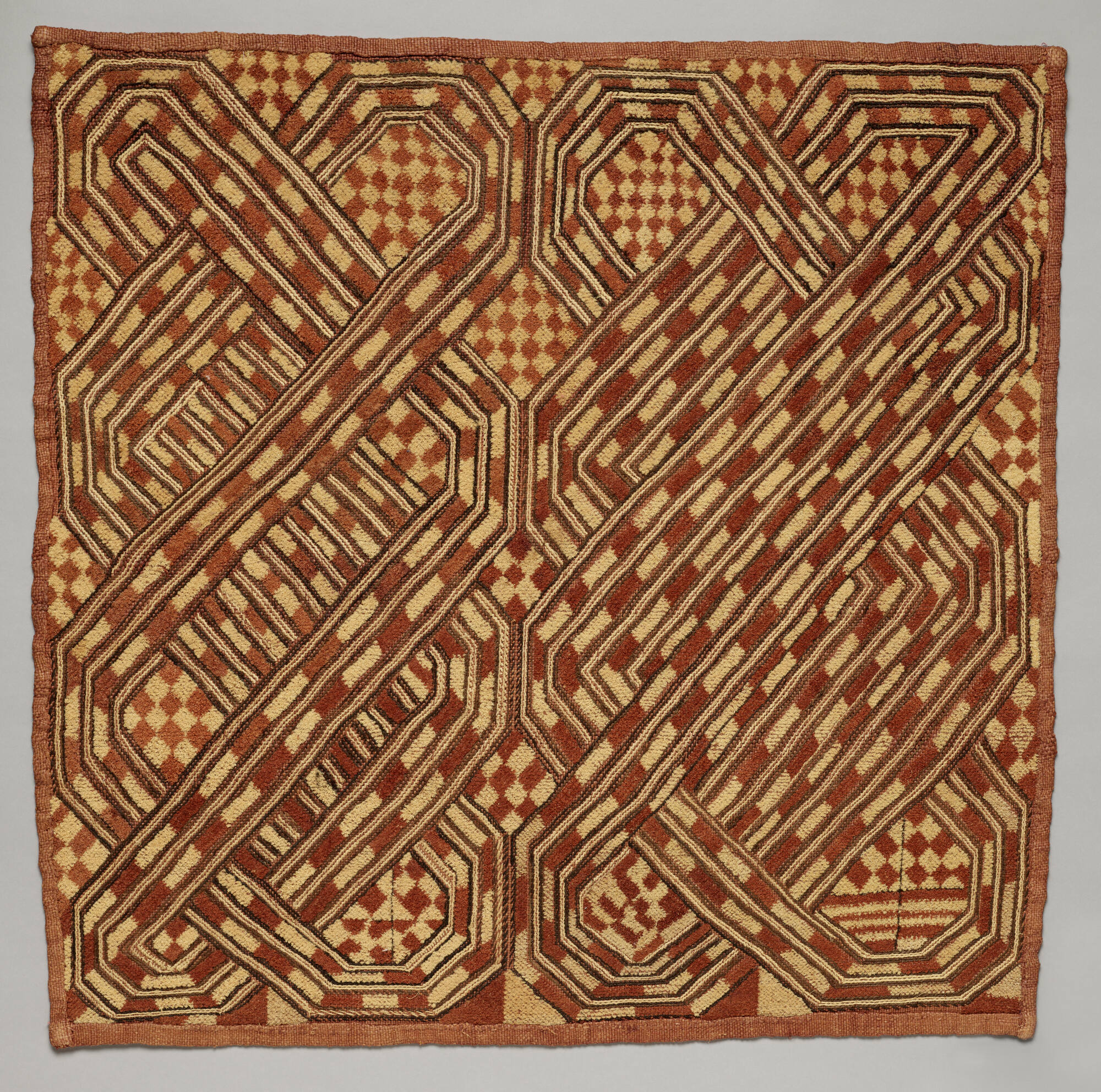 DescriptionThe pattern on this textile square consists of linear, interlocking forms. It includes small, alternating brown and white rectangles and squares that sometimes form checkerboard patterns.ProvenanceWith Fifi White, Shawnee Mission, KS, by 2000;