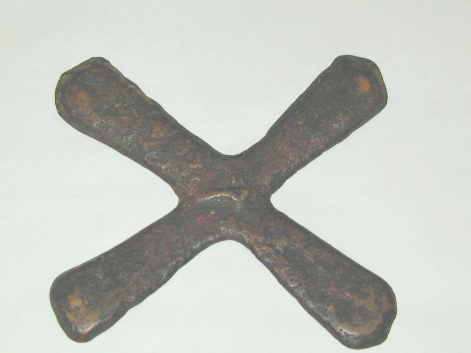 DescriptionA piece of cast copper in the shape of an "X." One side is basically flat while the other has some relief to it. The metal has a reddish tint on one side while the other side (the flat side) is more brown in color.ProvenanceWith Fifi White, Shawnee Mission, KS, by 1986-2000;