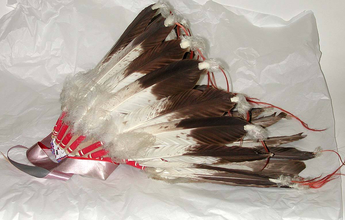 MediumEagle feathers, felt, rawhide, glass beads, silk ribbon, horsehair, and corduroy