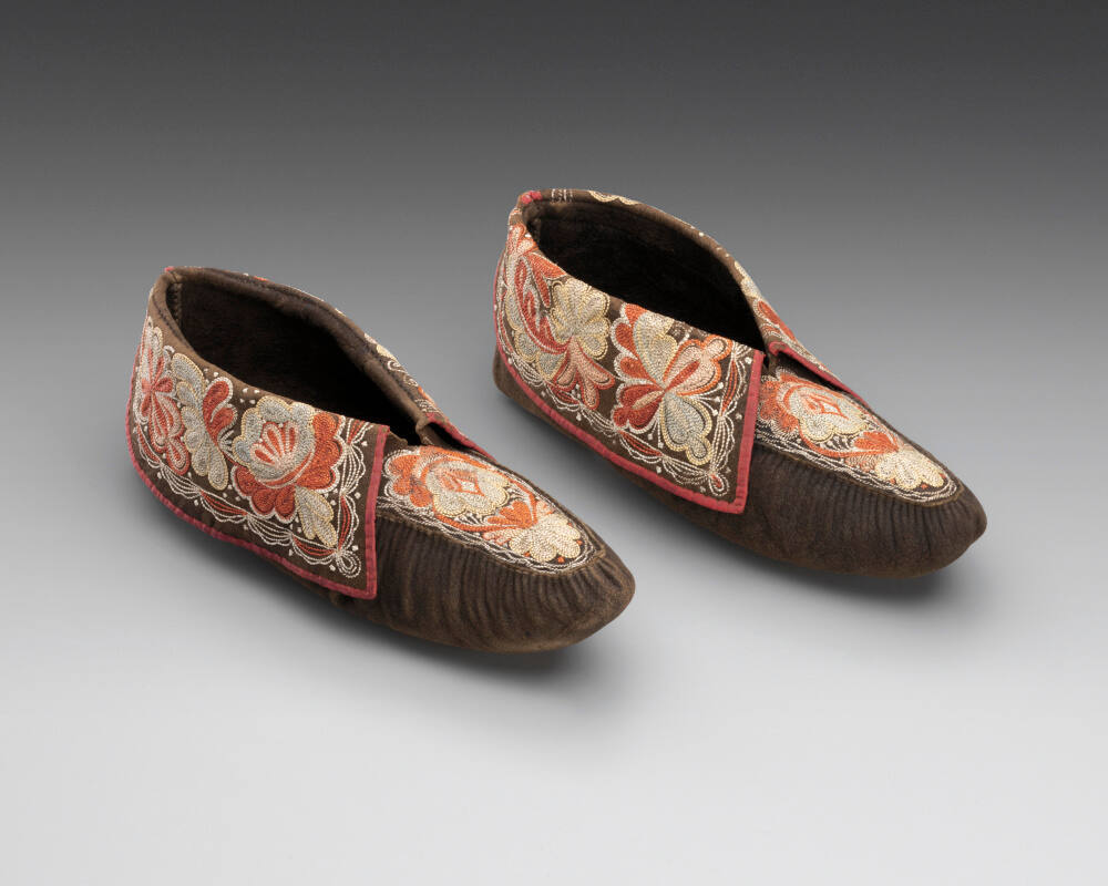 Gallery LabelThese finely embroidered moccasins are an early example of Native American art created for the tourist market. Young Huron women under the tutelage of Ursuline nuns in colonial Quebec developed a distinctive style of floral embroidery in the late 18th century, which was based on French Renaissance techniques and European floral designs. The resulting interaction evolved as an important source of income for Huron women in their production of souvenirs catering to the tastes of European and American travelers.