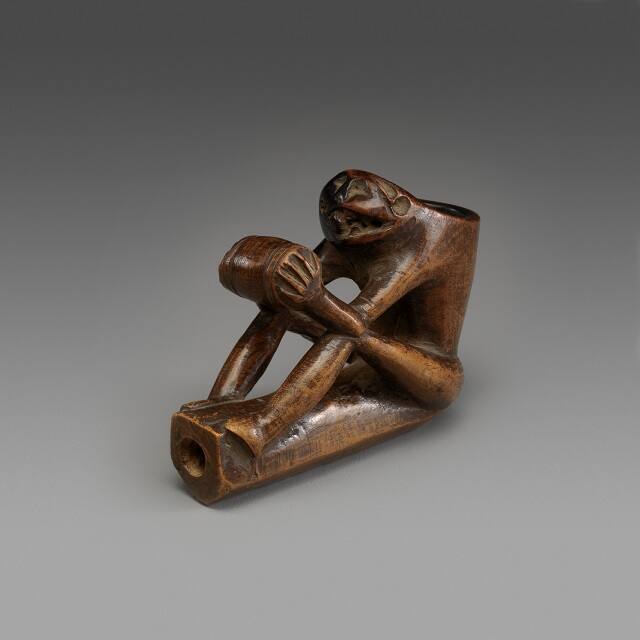 DescriptionA wooden pipe bowl in the shape of a seated figure holding a cylindrical object in its outstretched hands.Gallery LabelA number of early Eastern Woodlands sculptural works, notably pipe bowls, spoons and ladles, incorporate the image of a seated man holding a keg of liquor. This unusual pipe is set apart by the mask-like appearance of the figure's face, which bears a strong resemblance to ceremonial masks created by the Delaware and Iroquois peoples. This suggests the figure represents a guardian spirit, facing the smoker. Among the Wyandot and related groups, liquor obtained in trade, particularly rum, was used within a ceremonial context to enhance visionary experiences.