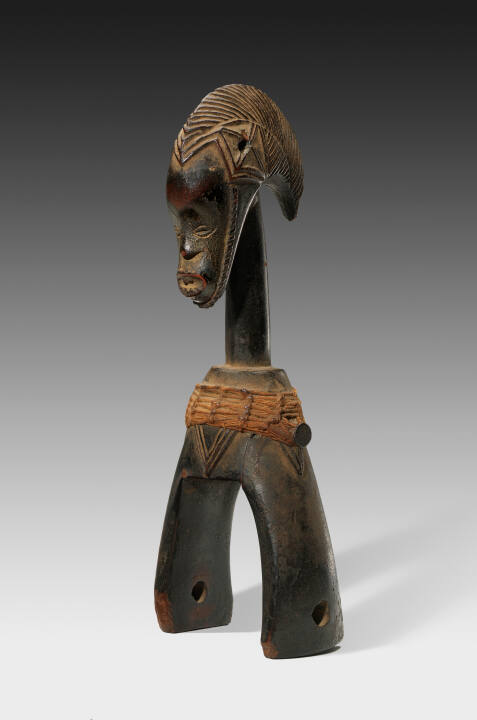 Gallery LabelThis elegant form once served as a pulley suspended from the frame of a treadle loom. It represents the refined aesthetic and skilled carving associated with the arts of the Guro and neighboring Baule peoples. Guro and Baule weavers commissioned carved pulleys, such as this human head combined with geometric patterning, in a variety of forms. They functioned as part of the loom but also embellished it, serving as public advertisement for the woodcarver's skills. During the weaving process, heddle pulleys move from side to side in a rhythmic motion with each sweep of the weaver's shuttle.