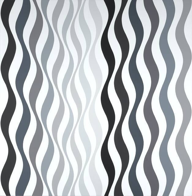 Bridget Riley's distinctive paintings, called Op Art by 1960s critics, delight and disorient the eye. A repetitive vocabulary of shapes and colors-in this case undulating ribbons ranging from black to cool gray-creates a visual experience that may generate a visceral or even emotional response.