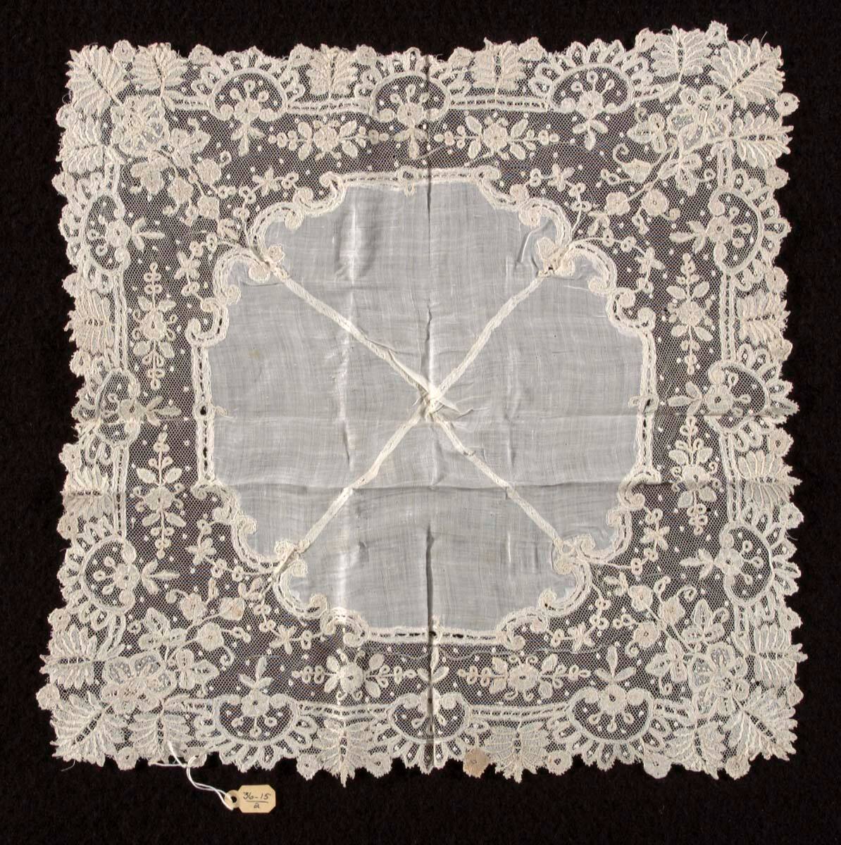 DescriptionBrussels application lace; bobbin-made part lace on a ground of machine-made net replaced (?) center of muslin in four joined pieces.